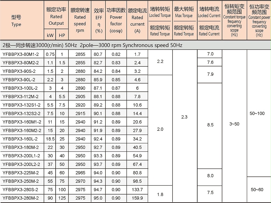 YFBP3系列高效率粉尘防爆型变频调速三相异步电动机是一种全封闭式高效率粉尘防爆型变频调速三相异步电动机,符合GB18613-2020《中小型三相异步电动机能效限定值及能效等级》中的3级能效等级。 该系列产品具有使用安全、结构紧凑、效率高、可靠性高、噪声低、重量轻、安装维护方便等优点。 该系列产品符合国家标准 GB/T 3836.1-2021《爆炸性环境 第1部分:设备 通用要求》、GB/T3836.31-2021 《爆炸性环境 第31部分:由防粉尘点燃外壳 “t” 保护的设备》和企业标准Q/1083 SLJ 049-2022《YFBBPX3系列高效率粉尘防爆型变频调速三相异步电动机技术条件(机座号80~355)》。防爆标志为Ex tb ⅢC T135℃ Db,适用于爆炸性粉尘环境。