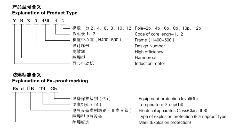 YBX3 系列高效率低压大功率隔爆型三相异步电动机,防爆标志ExdIIBT4Gb。该电动机适用于有爆炸性气体混合物存在的场所。ExdBT4 Gb 适用于工厂用川类 A、B 级;温度组别为 T1、T2、T3 和 T4 组爆炸性气体混合物存在的环境。